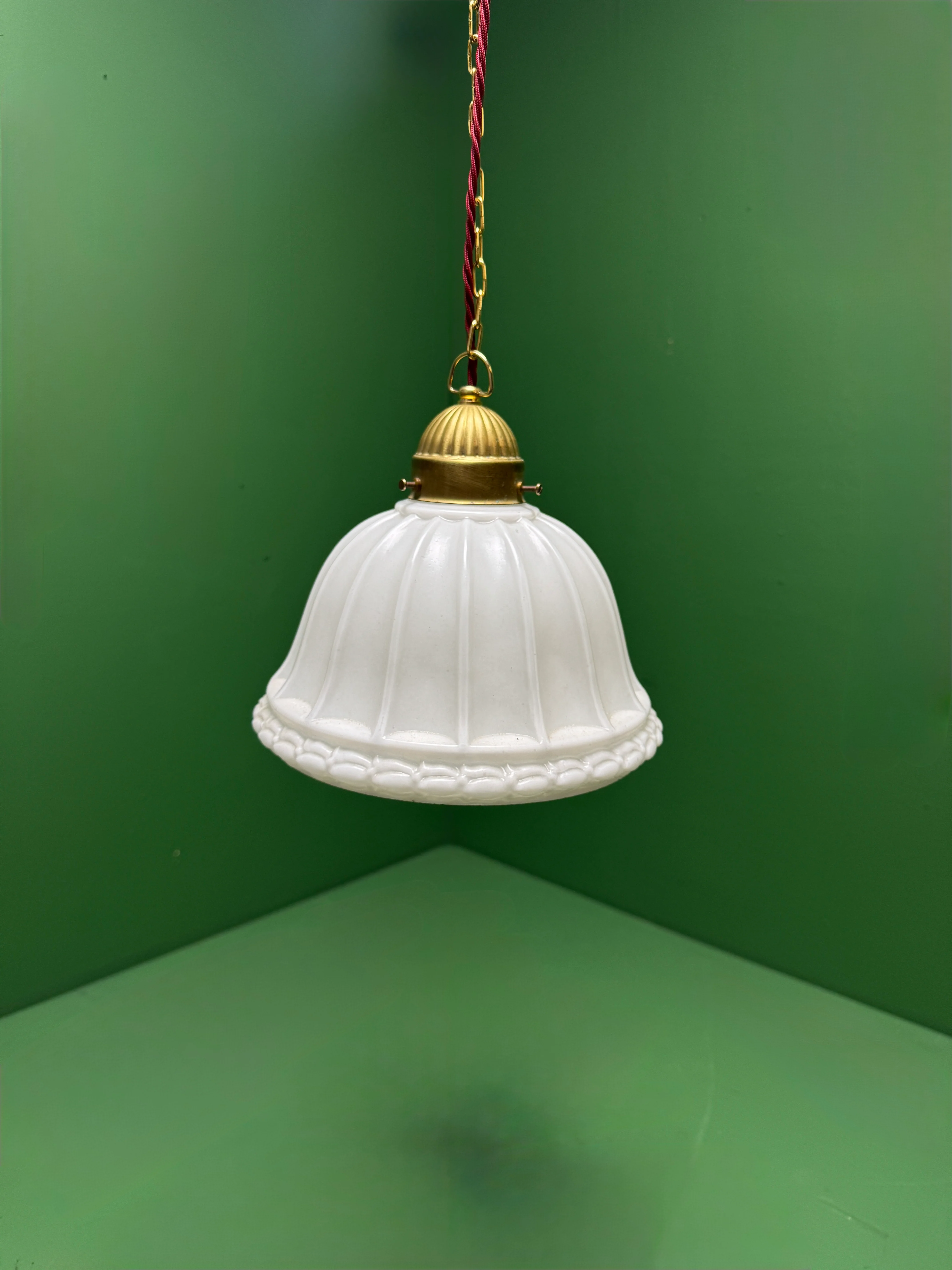 Cleaned, rewired & PAT tested safe & ready to go. Rewired using a metre of burgandy braided cable & comes with matching brass hanging chain & ceiling hook.