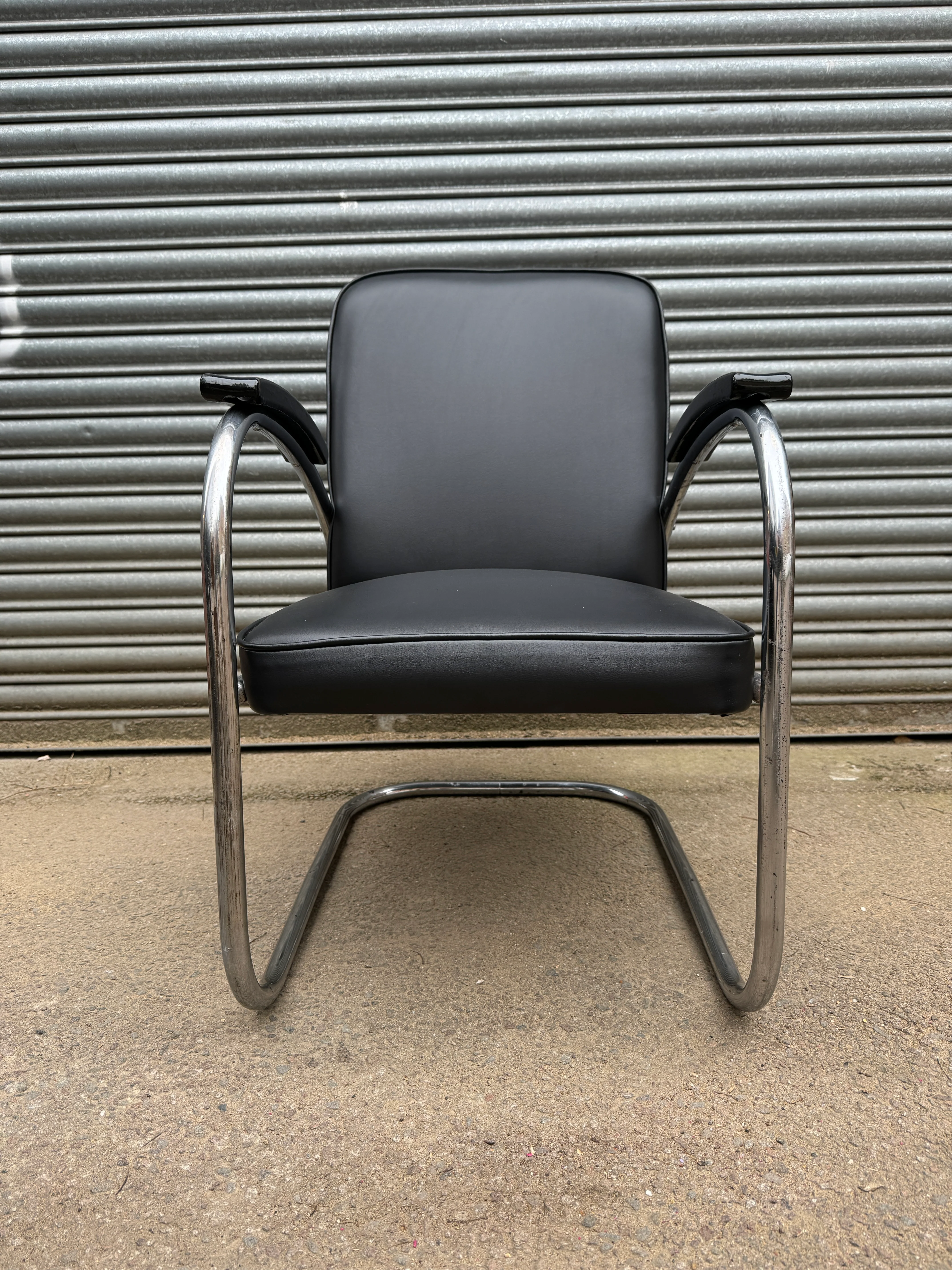 Armchair has been expertly reupholstered in a soft vinyl exactly as they were originally upholstered in. Chromed tubular frame which the seat hangs perfectly from, the tubular chrome has some ageing & wear but still fabulous for its age ( please see pictures ). The armchair has its original black lacquered wooden armrests.