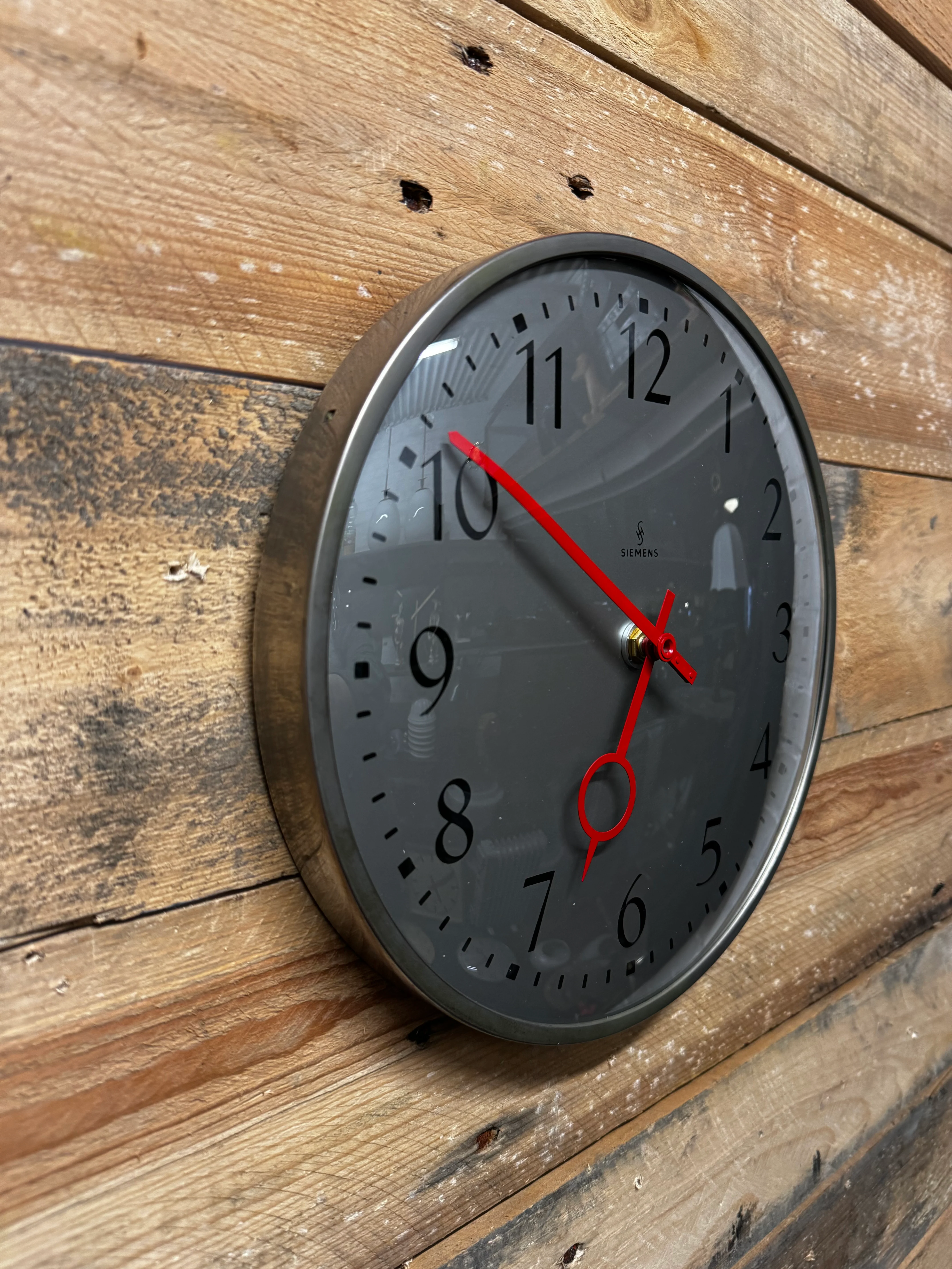 Metallic steel frame with steel clock face & unique clock hands which were renowned for Siemens clocks.