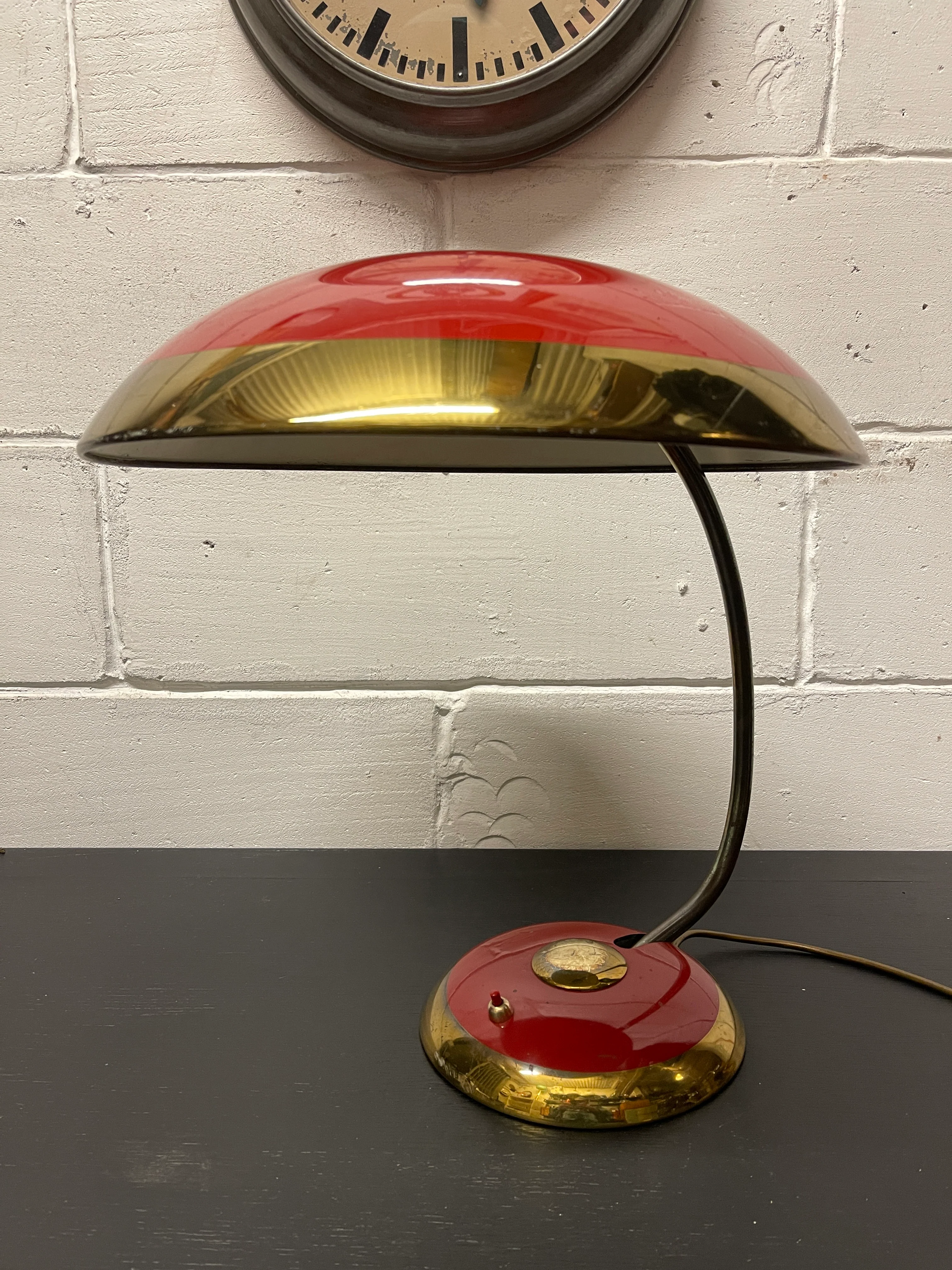 Amazing largest version of this iconic table lamp in bright red & brass with a 40cm UFO like shade. Brass stem is adjustable & shade adjusts to your desired position allowing the lamp to focus to different points.
