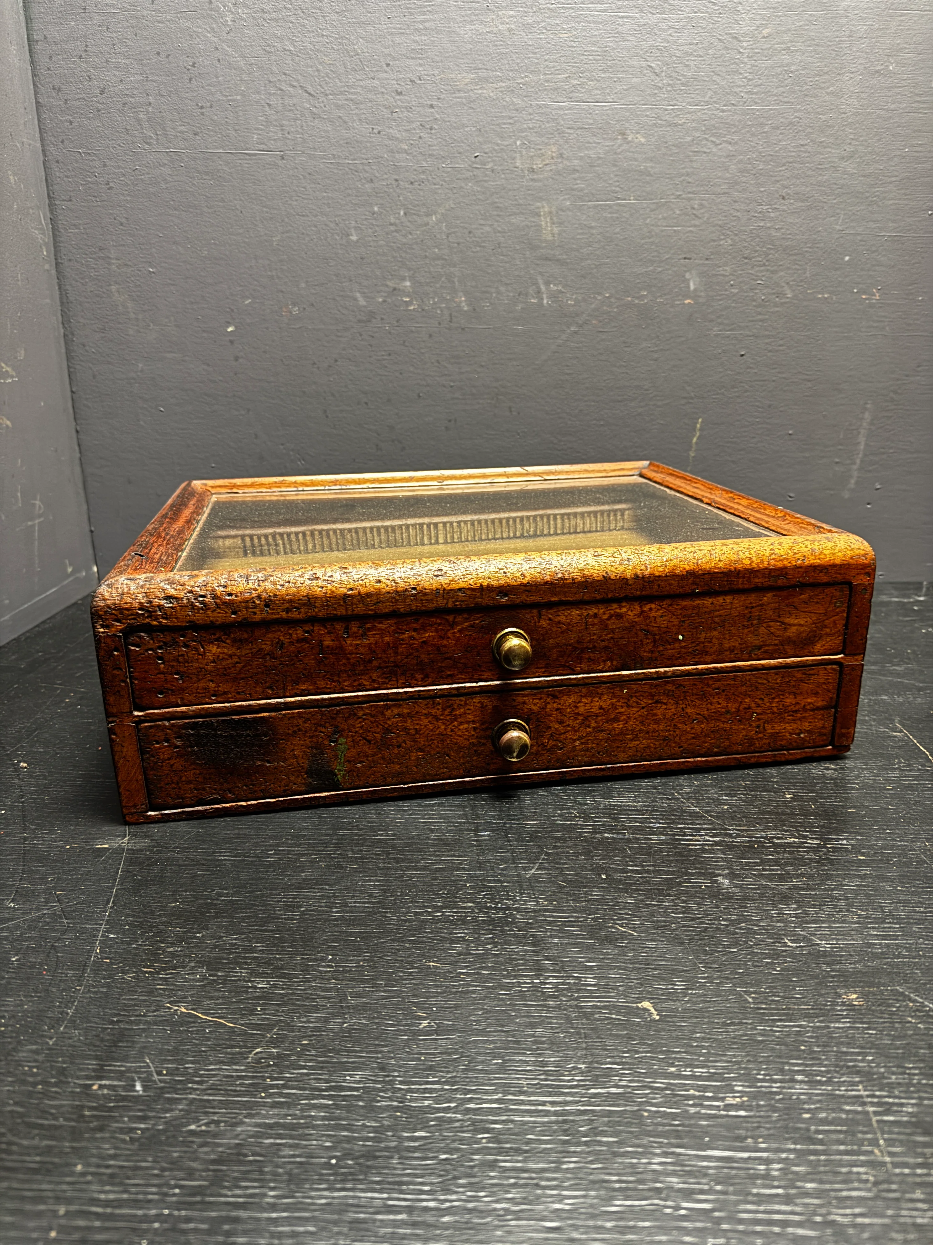 Glass on top displays all that is inside the top drawer. Cabinet has 2 drawers with beautiful Victorian brass knobs to pull open the drawers.
