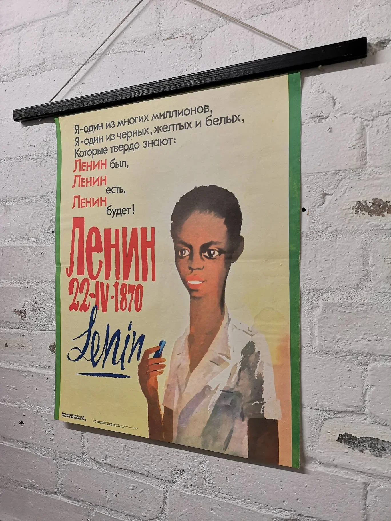 The poster reads , " I am one of many millions, I am one of the black, yellow, white who firmly know , Lenin was , Lenin is , Lenin will be ! Lenin 22-04-1870 ".
